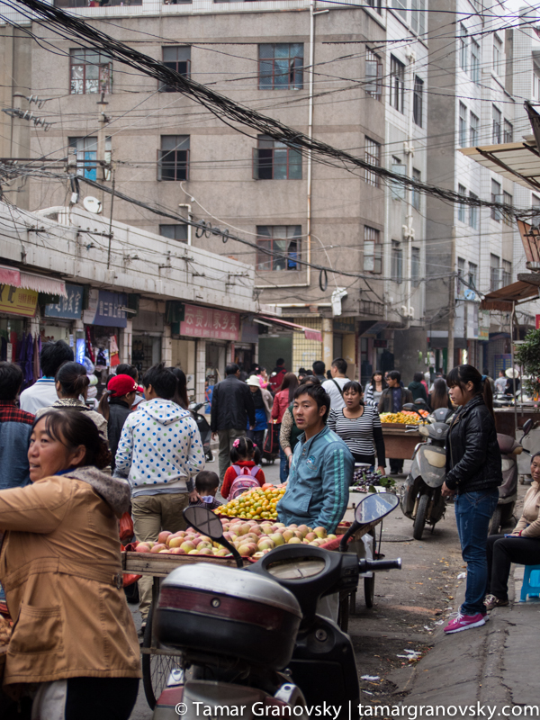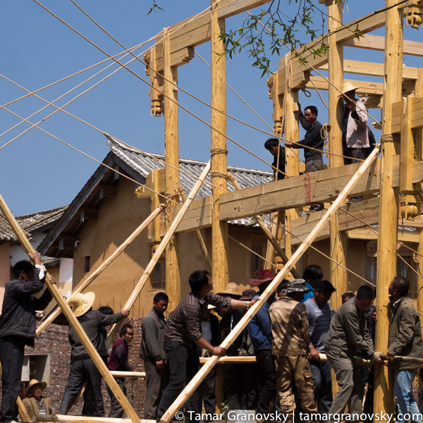 Buildings in Shaxi (and Dali) are made of a foundation of locally quarried stone and the walls are constructed with rammed-earth, covered by slaked lime and decorated on the outside with grey or blue ink-and-wash paintings. I have been told that nails are not used and instead, a system of double brackets supports the roof atop thick wood pillars. Like elsewhere in Yunnan, and the rest of China, the rooves are covered in round roof edge tiles. These tiles are used for decoration or for very specific symbolism (represented in the colours of the eaves, the specific roofing materials, and, finally, the roof top decorations). Old Town Shaxi is a maze of criss-crossing narrow alleyways, with one main street leading in and out of the village and a second, narrower street (filled with tourist shops, cafes, etc.) that leads to the old village square. A Friday market is held each week, as it has been for many, many years!