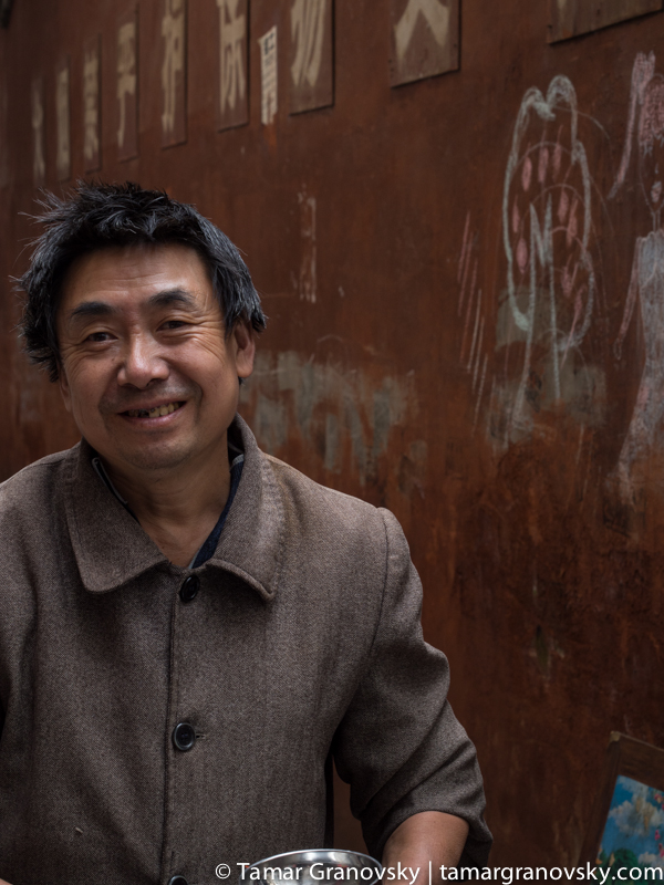 Our second day in Shaxi was spent wandering the alleyways, speaking with more locals, and having breakfast and supper at the Long Feng Muslim Restaurant. The women who work there are welcoming and talkative, and laugh a lot!. The food is excellent, and the place is impeccably clean. At the front of the restaurant is the kitchen – open to the street. Behind this area and the main eating area is a small courtyard where the vegetables are prepared. Aging beef hangs from beams throughout the restaurant and courtyard. Breakfast consisted of a bowl of noodles in a spicy beef broth, with pieces of beef and vegetables. As is common, one can add extra condiments such as garlic, Sichuan pepper, pickled vegetables, hot pepper, etc. I think this soup may have been the best I have eaten in China. At supper we ordered a bowl of vegetable stew, as delicious as was the morning’s soup.