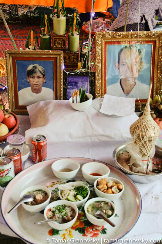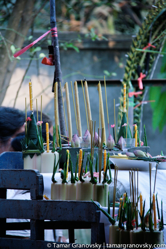 This year I travelled through Phnom Penh, Koh Kong, Kampot, and Kampong Cham, Cambodia during the festive three-day Cambodian New Year (Chaul Chnam Thmei). As with many cultures around the world, holiday preparations begin a few days in advance. Family and friends visit and wish each other good fortune and health. Every household, restaurant, and store has an offering table covered with fruit, drinks, flowers, snacks, and incense. Traditionally, on the eve of the holiday, people eat lavish meals and burn incense and candles to welcome a new god and say farewell to the old god. Families take food to monks on the first day, children give money or clothing to their parents on the second day, and everyone takes rice offerings to their respective temples. On the third day and night, it is common to go to the temple to douse and bathe Buddha statues and each other; gifts,along with the fragrant water, are also offered to these Buddhas. Many Khmer return to their home provinces to celebrate and it is common for family and friends to gather and play traditional Khmer games.
