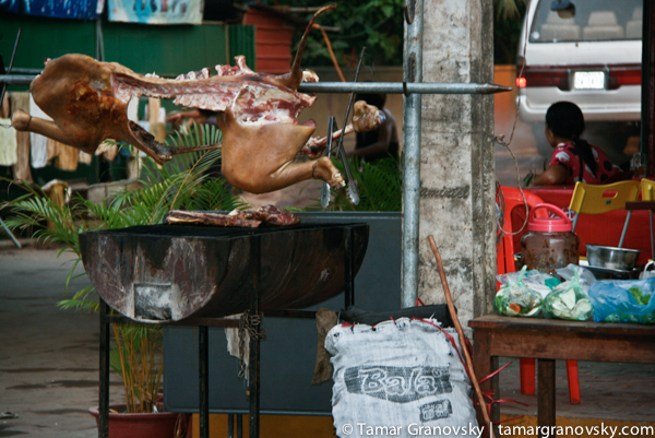 - Bai sach chrouk: This is a typical pork and rice dish eaten for breakfast. The pork – sometimes marinated in garlic or coconut milk – is grilled slowly over charcoal. Fried scallion and/or green tomatoes and/or fresh cucumbers and/or a fried egg are served on top, along with a small plate of spicy pickled cucumbers and carrots. The typical way to eat it is with a spoonful of each, at the same time. The best place I have found is at the corner of streets 15 and 136.